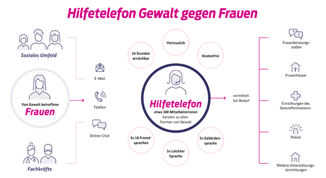 Das Hilfetelefon "Gewalt gegen Frauen" bietet Betroffenen die Möglichkeit, sich zu jeder Zeit anonym, kompetent, sicher und barrierefrei beraten zu lassen. Qualifizierte Beraterinnen stehen den Hilfesuchenden vertraulich zur Seite und vermitteln sie bei Bedarf an Unterstützungsangebote vor Ort, etwa an eine Frauenberatungsstelle oder ein Frauenhaus in der Nähe. Barrierefreiheit und Mehrsprachigkeit sichern den Zugang für Frauen mit Behinderung und geringen Deutschkenntnissen. Auch Angehörigen, Freundinnen und Freunden sowie Fachkräften steht das Hilfetelefon für Fragen und Informationen zur Verfügung.