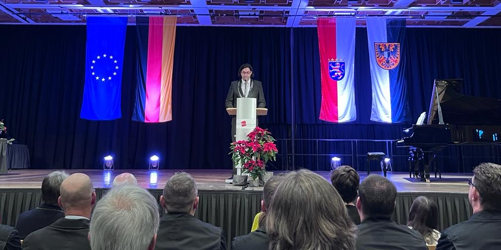 Am 24. September hatten die Wählerinnen und Wähler Kjetil Dahlhaus zum Bürgermeister gewählt. Mit 60,58% der Stimmen hatte der 44-jährige Unternehmer und Marketingfachmann klar und im ersten Wahlgang das Rennen gemacht. Knapp drei Monate nach dem Wahlerfolg und nur wenige Wochen vor seinem Amtsantritt am 8. Januar 2024 leistete Dahlhaus vor Stadtverordnetenvorsteher Hollender und Erster Stadträtin Marion Götz (SPD) den Amtseid und erhielt seine Ernennungsurkunde. Nicht nur für Kjetil Dahlhaus selbst ein bewegender Moment, vor allem auch für seine Familie und seine Wegbegleiterinnen und Wegbegleiter im Wahlkampf, die gerne seiner Einladung zur Amtseinführung in die Stadthalle gefolgt waren.